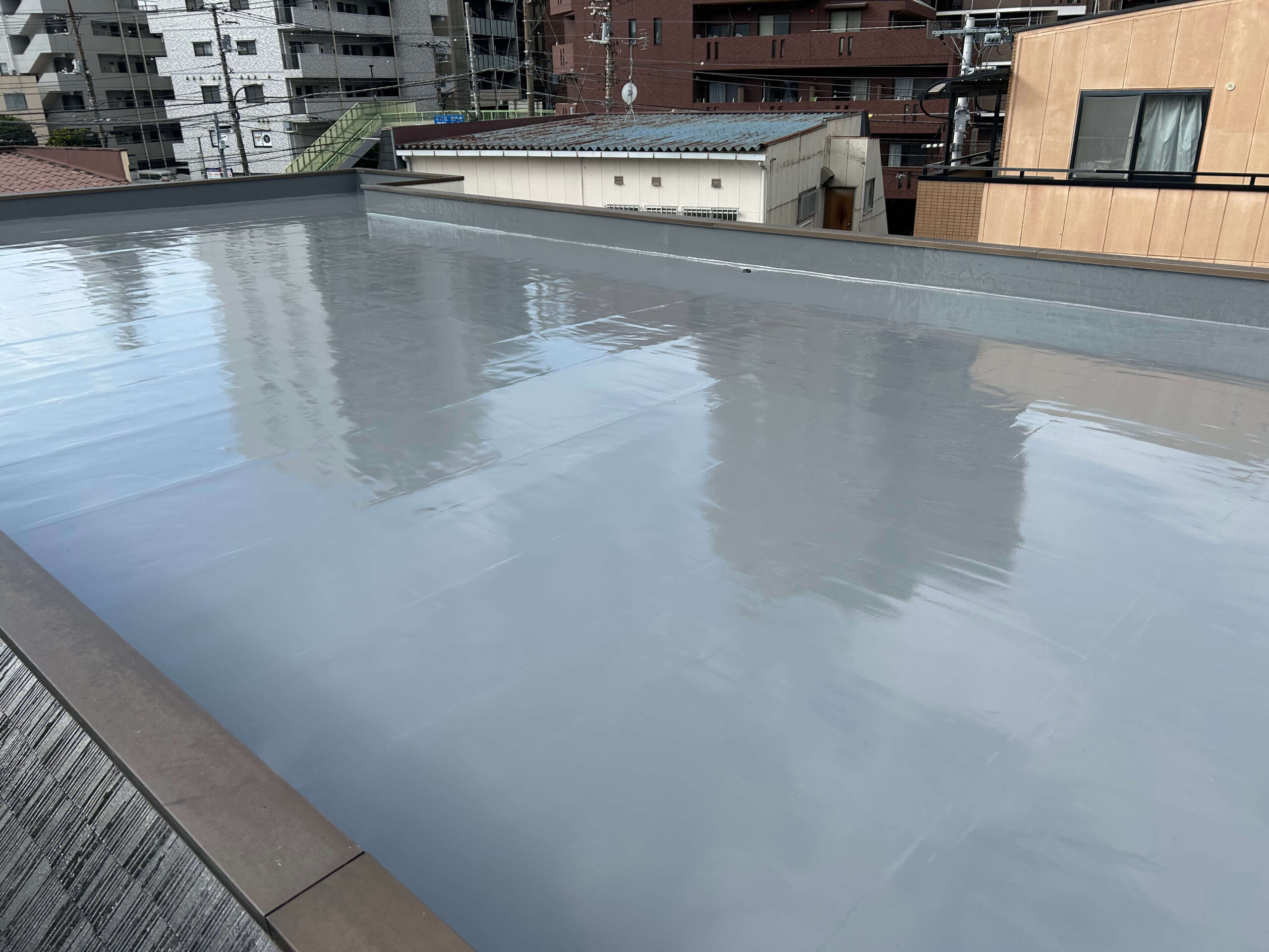 既存防水の改修工事を中心に対応しています。下地の状態や防水層の状況を確認し、現場条件に合った施工方法を判断します。立上りや取り合い部まで含めて確認し、水の侵入経路を外さないことを意識した施工を行っています。仕上がりの見た目だけでなく、施工後に問題が起きにくい状態で引き渡すことを重視しています。